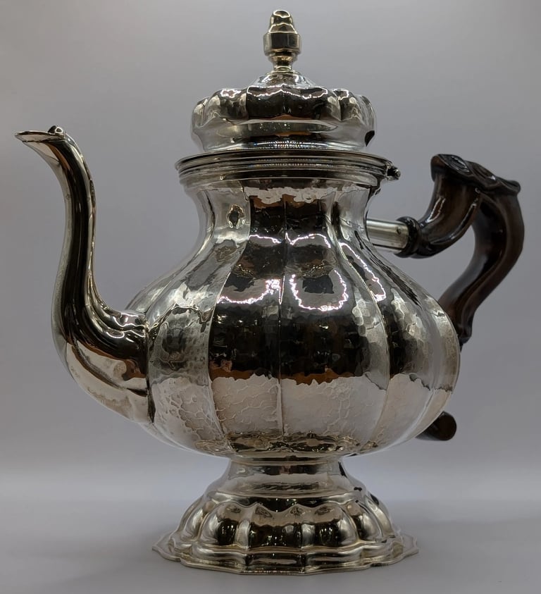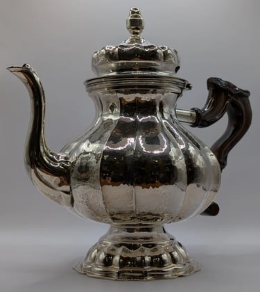 Questa elegante e importante teiera presenta un design caratteristico, con una forma baccellata e una finitura martellata che ne esalta la lucentezza e la lavorazione artigianale. Il manico sagomato in legno, aggiunge un tocco di calore e raffinatezza, oltre a garantire una presa comoda e sicura. Il coperchio è sormontato da una presa a bocciolo o a fiore, un dettaglio tipico dello stile rococò o georgiano. Le teiere in argento come questa erano prodotte per le classi sociali più elevate e sono ricercate oggi per il loro valore storico e decorativo. I marchi incisi sotto la base, se presenti, sono fondamentali per determinarne l'autenticità, la purezza dell'argento, la provenienza e il periodo di produzione. 97o grammi di argento 800.